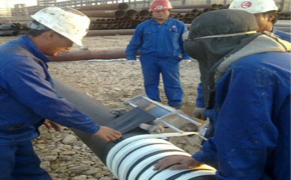 4、纏繞膠帶以搭接帶寬的50~55%進行,形成一遍兩層,滿足特加強級別,達到總厚度≥2.0mm。在施工過程中要增大膠帶的平衡漲力,達到緊貼于表面,實現(xiàn)包平無空隙、無皺折效果。